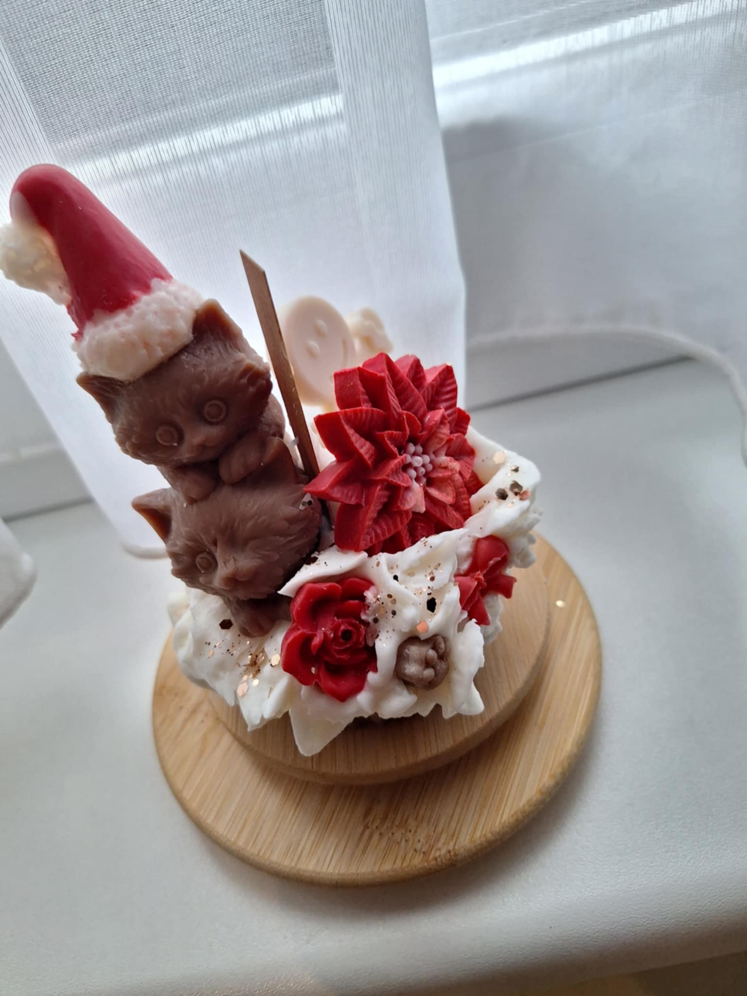 Mise en scène d'un duo de petits chats perchés sculpté & coiffé d’un bonnet de Noël, entouré d'une fleur de Noël et de petit biscuits, symboles traditionnels des fêtes de fin d’année. La base cupcake/muffin crée un rendu délicatement gourmand, enchanteur et cosy, parfait pour ajouter une touche féerique à votre intérieur.