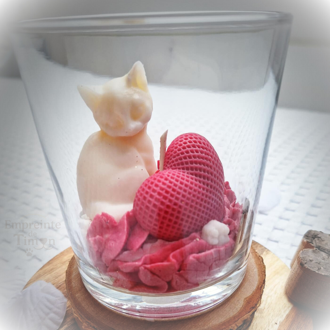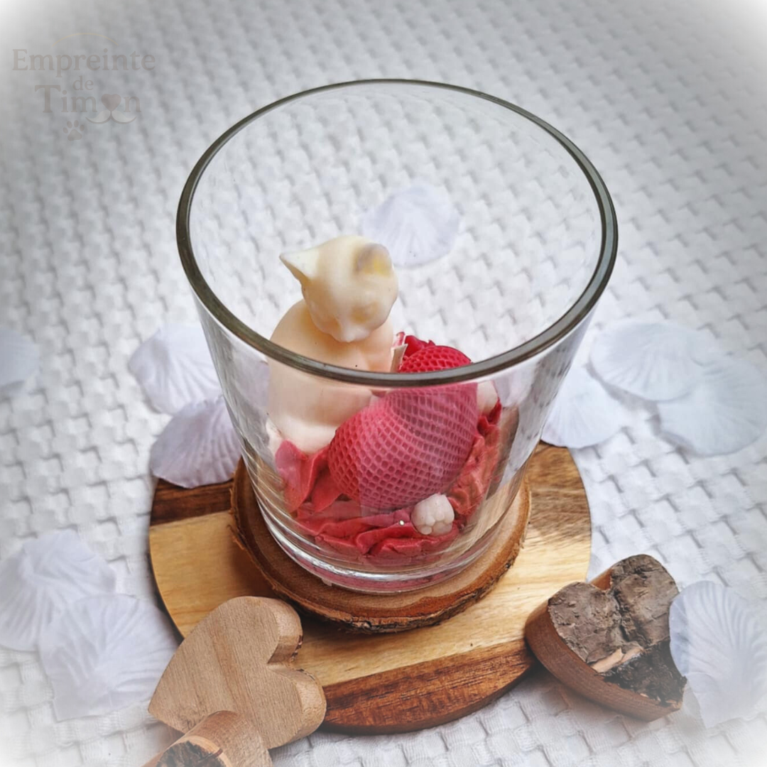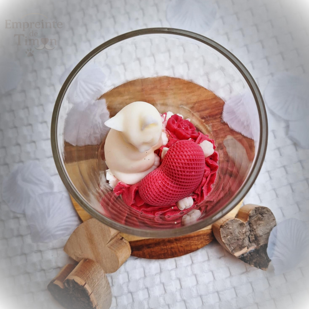 Bougie gourmande mettant en scène des chats, des cœurs et des fleurs, dans une composition pensée spécialement pour la Saint-Valentin.