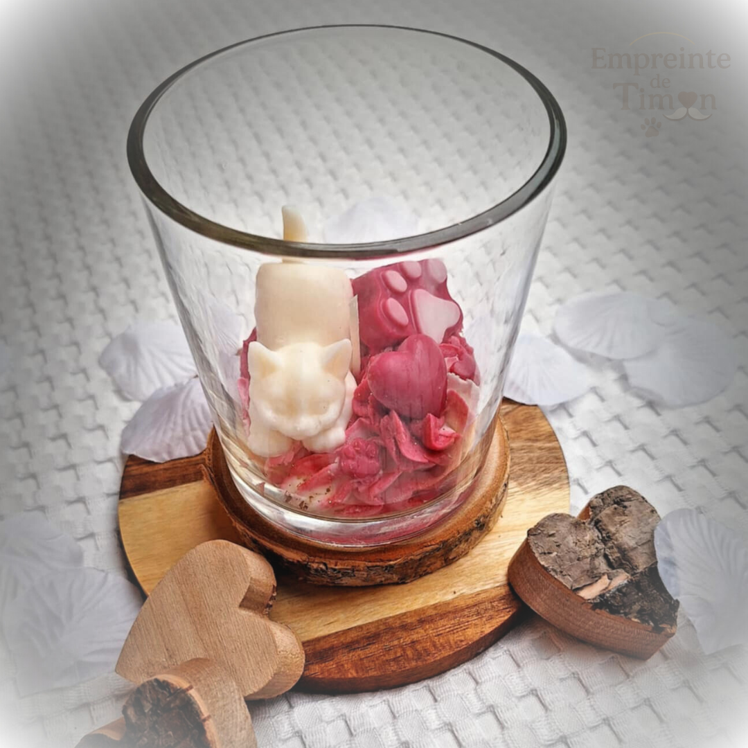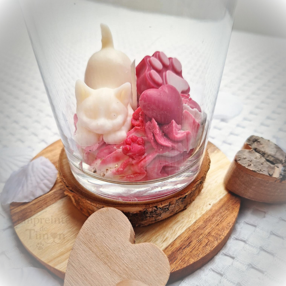 Bougie gourmande mettant en scène des chats, des cœurs et des fleurs, dans une composition pensée spécialement pour la Saint-Valentin.